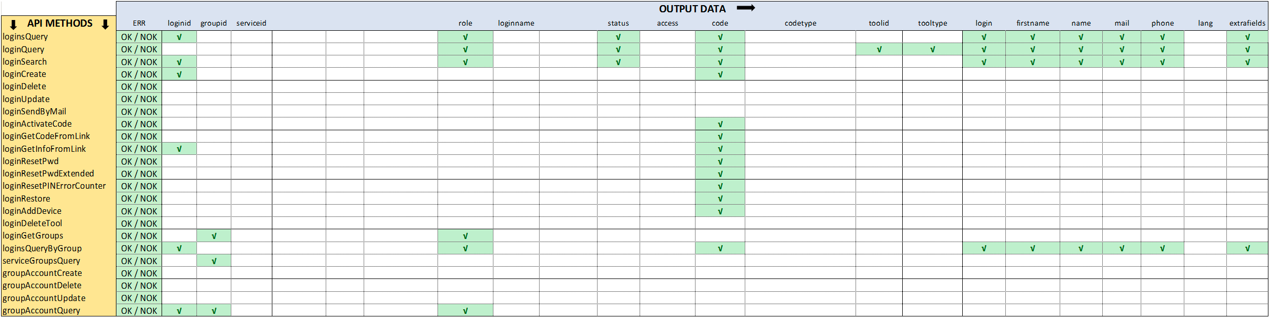 This table shows for all the API methods, what are the data outputs. It helps you to quickly determine which methods can provide which parameters.