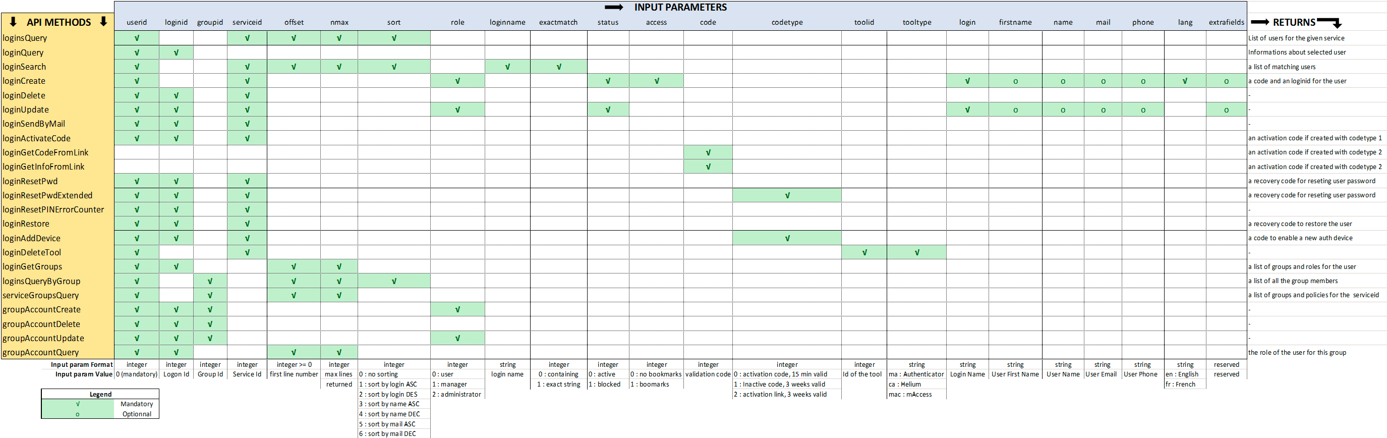 This table is a sum up in one view of all the API methods detailed above, and their input parameters and possible values.