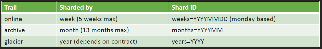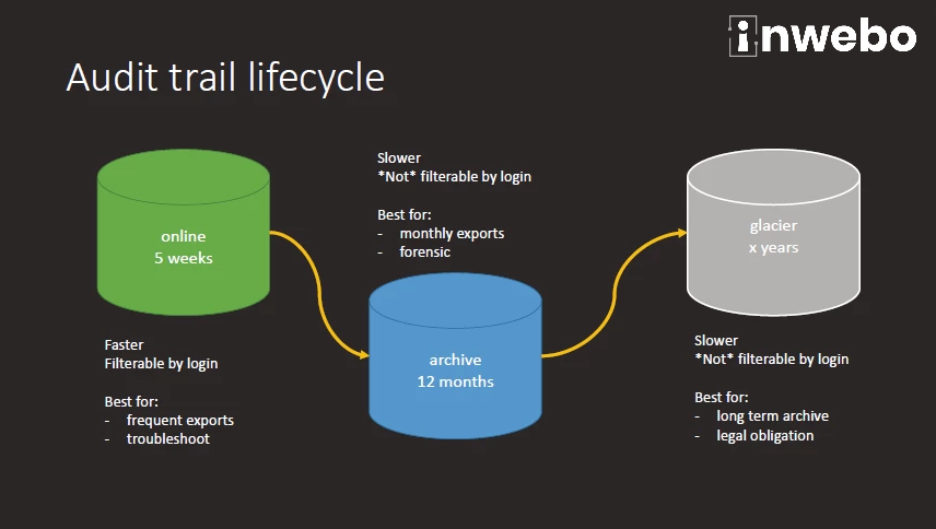 The Audit trail life-cycle is divided in 3 stages with distinctive time-frame, access time and storage mode.