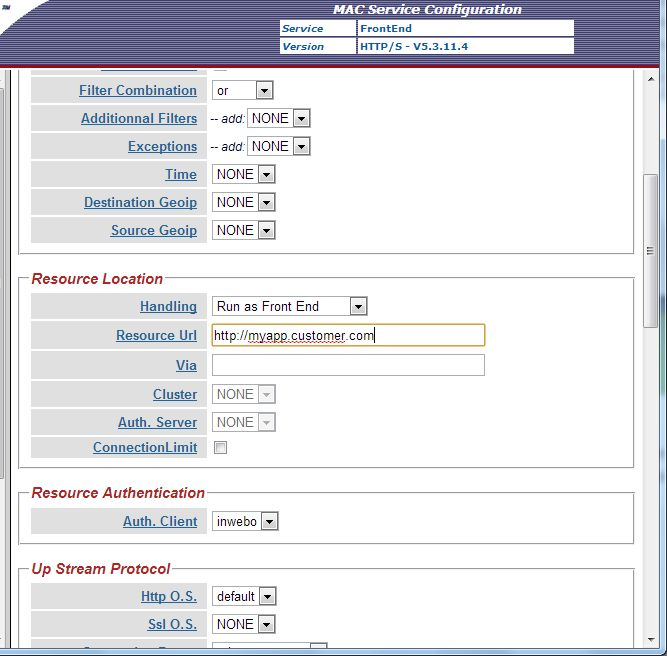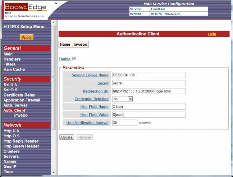 Edit the “FrontEnd” service. In the left pane menu, got to Security → Auth. Client and create a new Authentication Client called “inwebo”. In the “Redirection Url” field, type the IP address of the BoostEdge Server with port 2000, as specified earlier on the service rule: