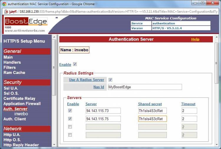 Close the “FrontEnd” service and open the “authentication” service. Go to Security → Auth. Server and create a new authentication server called “inwebo”. Type in the IP addresses of the 2 InWebo radius servers, and choose a Shared secret (the Radius secret is a string that will be used to cipher the Radius requests).