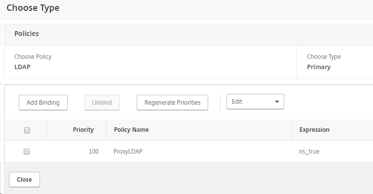 Select your newly created LDAP policy and bind it to this virtual server, select close.