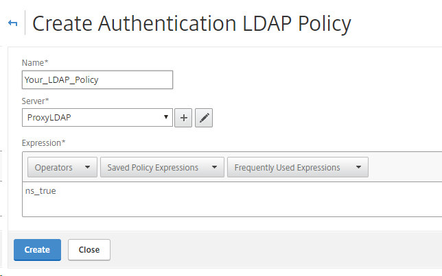 ![]() | In the configuration utility, on the Configuration tab, expand Netscaler Gateway > Policies > Authentication. Select "LDAP", and then in the details pane, on the Policies tab, click Add . |