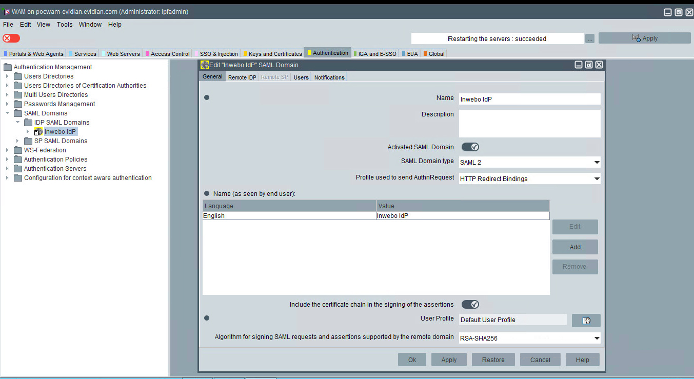 The inWebo SAML domain configuration is done.