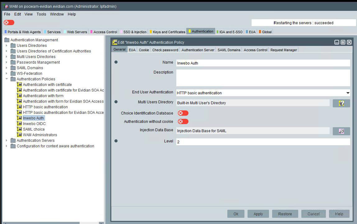 Evidian Web Access Manager (WAM) can be configured to support multi-factor authentication in several modes. The SAML authentication will be used for the purpose of working with Inwebo IDP.