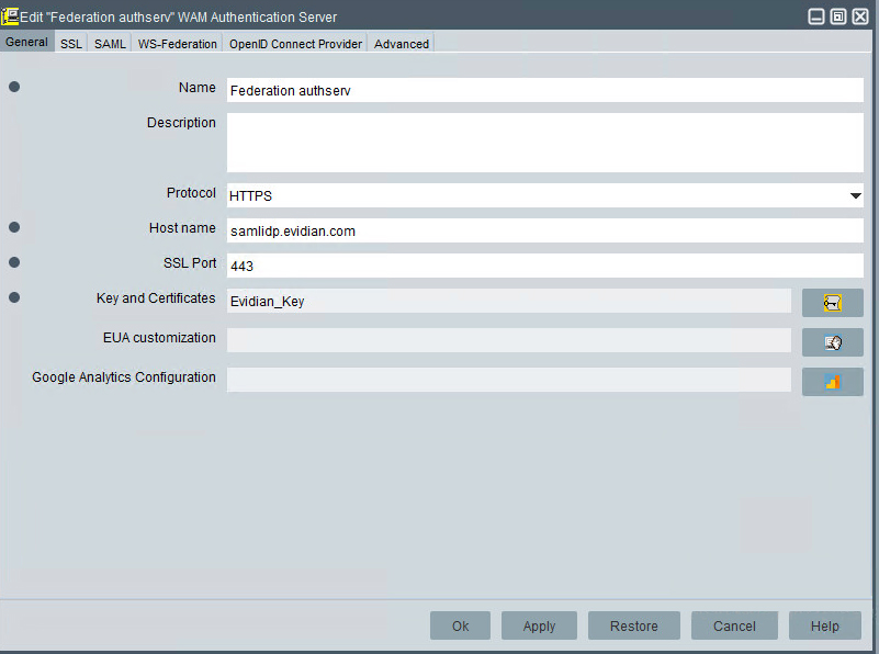 Key and Certificates: Object Signing Certificate used to sign SAML assertions returned by the WAM Authentication Server. Select your Key and Certificates in the list.
