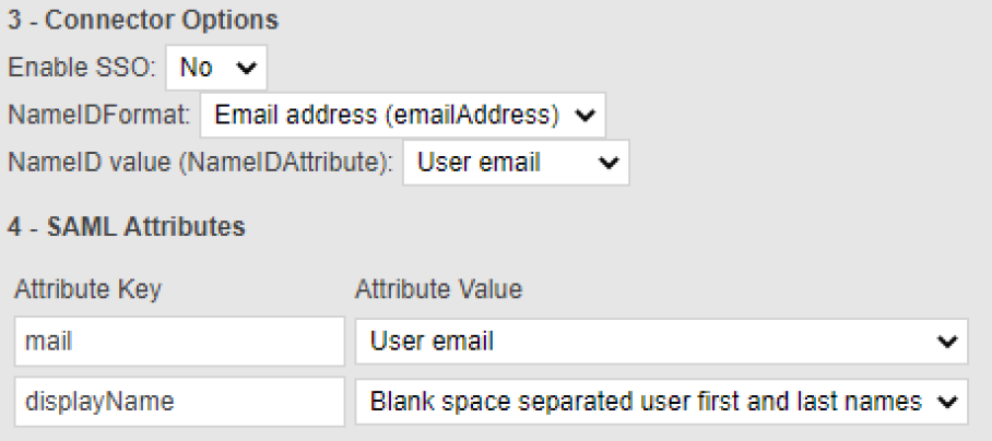 In section 3 - Connector Options of the SAML connector change the NameID Format to Email address and change the NameID value to User email.