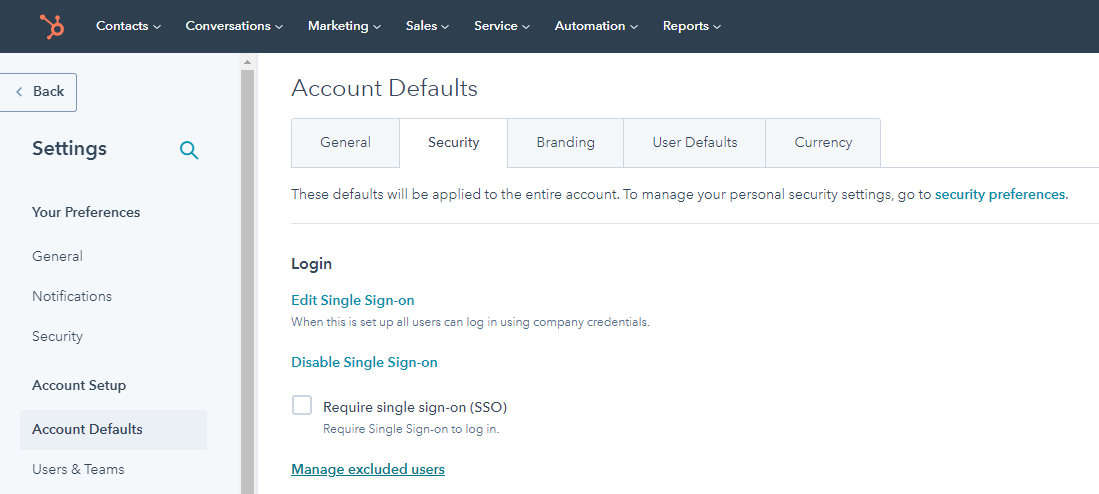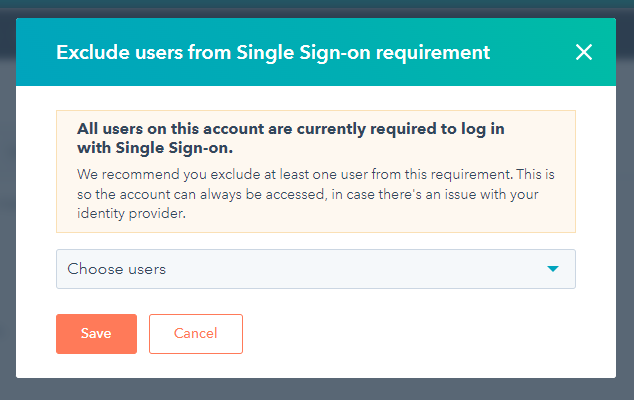 Use the drop-down menu to select which users to exclude from the SSO policy and click on Save. Those users will be allowed to connect using their HubSpot login and password.