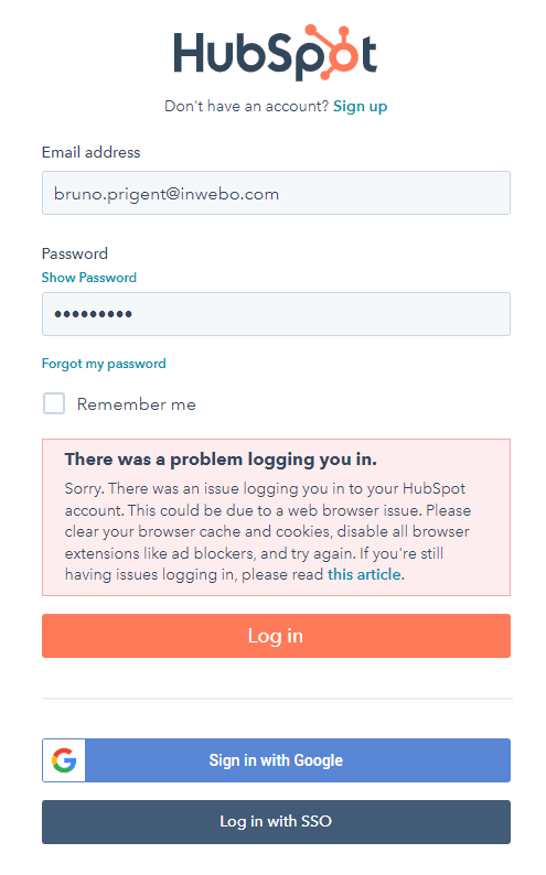 From now when a user tries to sign-in with his login and password, HubSpot shows the following error. The user now needs to click on “Login with SSO” button.