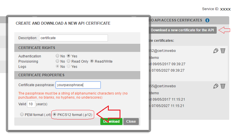 Download an Certificate from the Administrator console (“Secure sites” > “Download a new certificate”). Choose the .p12 format.