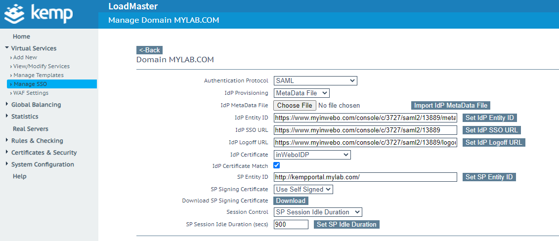 Prior to configuring the inWebo connector, you must convert the certificat downloaded from Kemp and build the metadata to match your environement. The inWebo connector will be updated with this information. The last step will be to create a Secure site linked to the inWebo SAML connector.