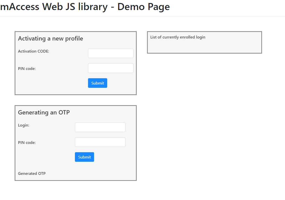The mAccess Library (WEB) is a small JavaScript library that lets you perform simple operations (OTP, Activation, PIN or password operations..) with your TrustBuilder MFA service.