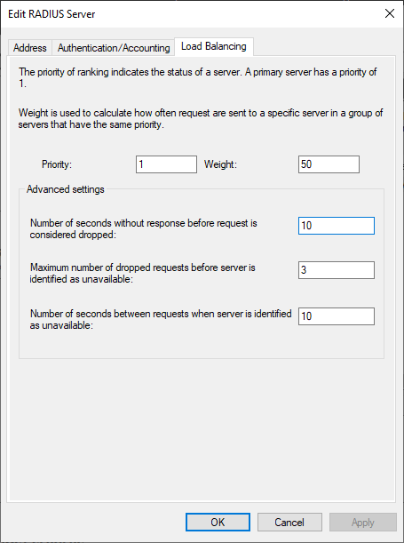 For “Push” RADIUS mode: Configure NPS to send authentication requests every 30 seconds and fallback to another server after 1 failed attempts.