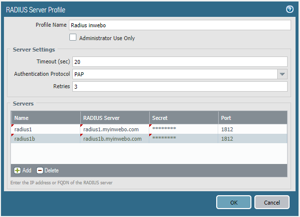 Click Add and declare the inWebo RADIUS pair you want to use. Make sure the "Timeout" and "Retries" values suits you needs. You can check our guide Redundancy and RADIUS-client configuration for best practice.