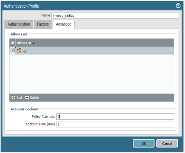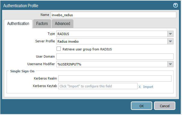 Click "Add", change the type to "RADIUS" then choose the Server Profile previously configured. Leave the "Factors" tab default configuration. In the "Advanced" tab make sure you allow your users to use this Authentication profile.
