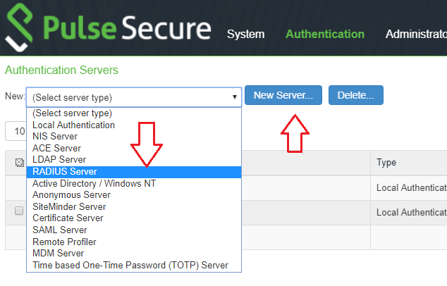 On the Authentication servers page, at the top of the page select : "RADIUS Server" in the drop down list and click on "New Server..."