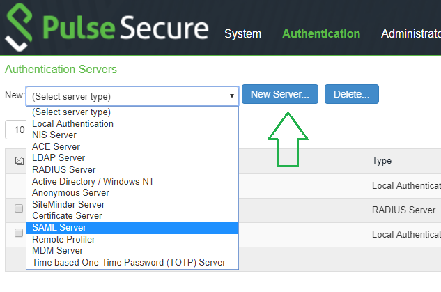 On the Authentication servers page, at the top of the page select : "SAML Server" in the drop down list and click on "New Server..."