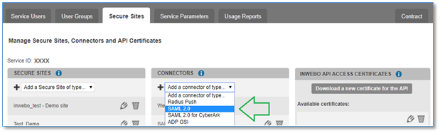On Secure Site tab click "Add a Secure Site of type ..." and choose from the list the SAML 2.0 connector you just created.