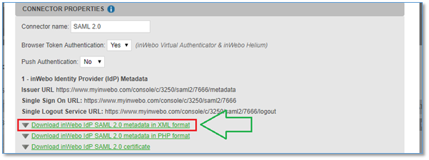 Download inWebo Idp SAML 2.0 metadata in XML format