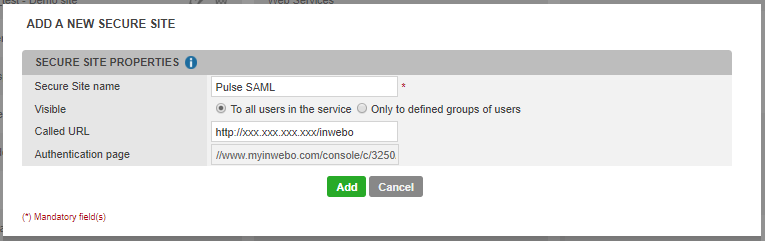 Choose a name and configure "Called URL" to be your "Pulse inWebo URL" configured above.