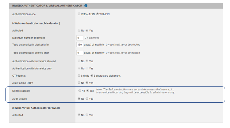 Les paramètres d’activation du Selfcare et de l’Audit sont visibles dans la console d’administration, dans la section Authenticator des paramètres de votre service.