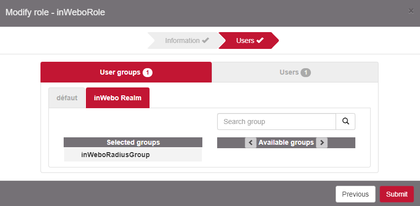Select the real created / modified previously and search for one or more user group / user to map with that role. Add them to the Selected groups or Selected user columns.