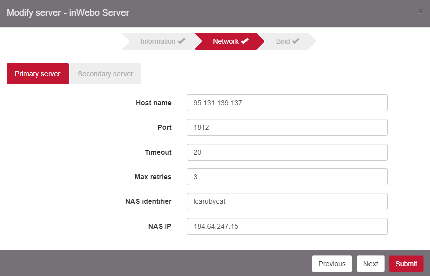 Whether you need to set a secondary RADIUS, you might use the secondary inWebo RADIUS: radius-b.myinwebo.com (217.180.130.59)