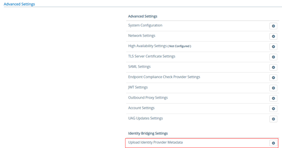 In the “Advanced Settings” menu, in the section “Identity Bridging Settings”, select “Upload Identity Provider Metadata”