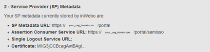 Then download your inWebo metadata by using the link “Download inWebo IdP SAML 2.0 metadata in XML format”.