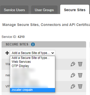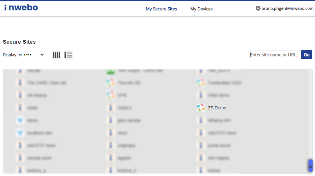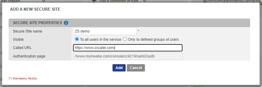 In the “Secure site” column click on “Add a Secure Site of type” and select the SAML connector name you configured above. You can set the Called URL to point to one of the ZPA protected applications or any other URL relevant in your context. The Called URL setting is only used to set a bookmark for the user on his Myinwebo portal, it has no impact on the security.