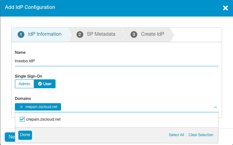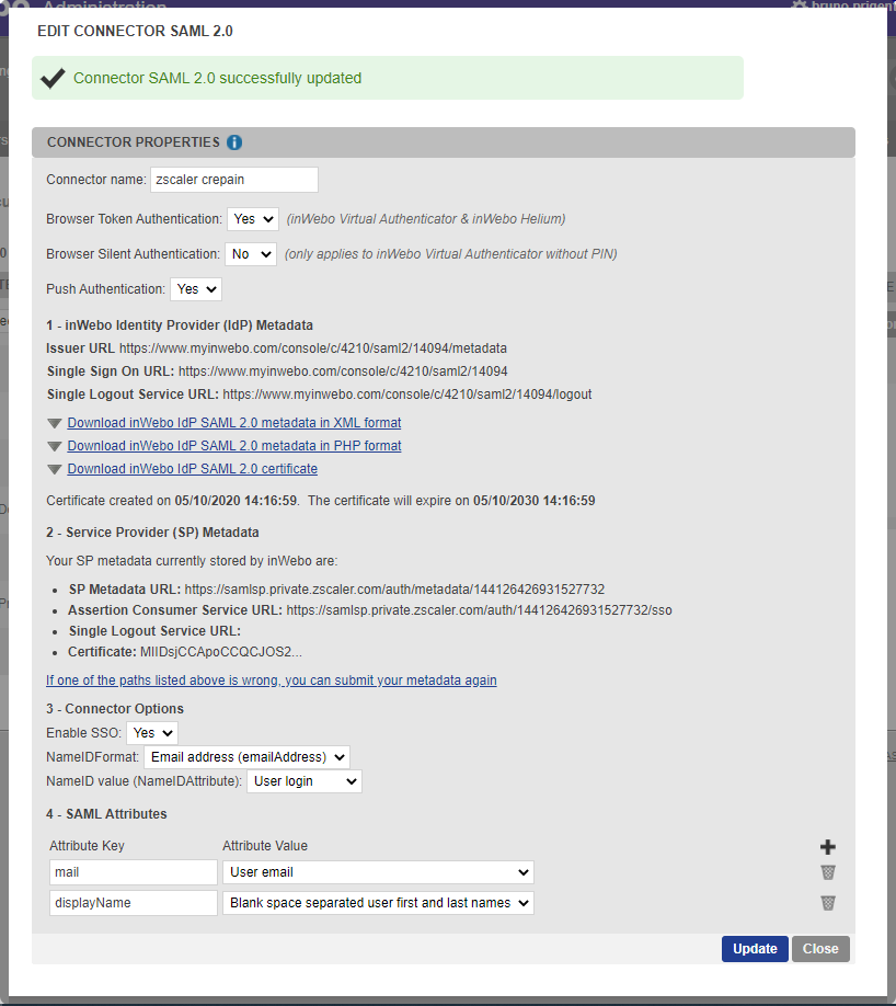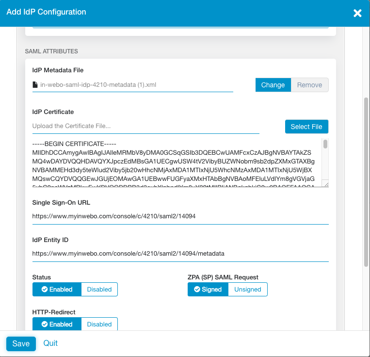 Once you configured inWebo and downloaded the IdP Metadata, you can use them to finish the SSO configuration you’ve started in the first step of that guide. So please return to ZPA admin portal and navigate to Administration->Authentication->IdP Configuration and click to resume the inWebo IdP Configuration. You should see the final step of configuration to upload your IdP metadata file (xml file). Once Metadata is uploaded to the portal please make sure that all fields are completed: Certificate, Sign-On URL and IdP Entity ID.