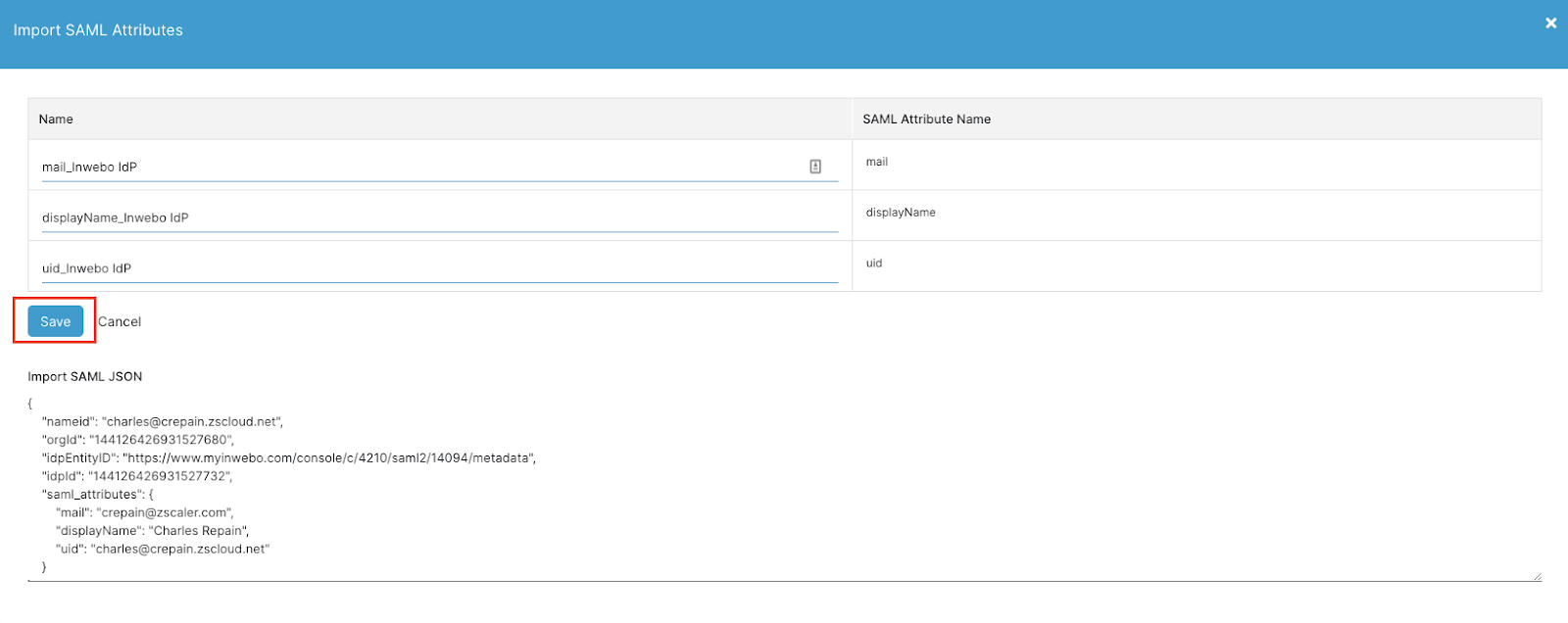 Once these two steps are done and the authentication process successfully you should be able to review the imported attributes. Then click “Save”.