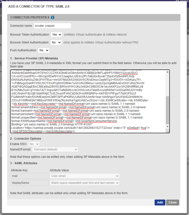 In the inWebo Administration console, select the "secure sites" tab and add a SAML 2.0 connector in the "connectors” section.