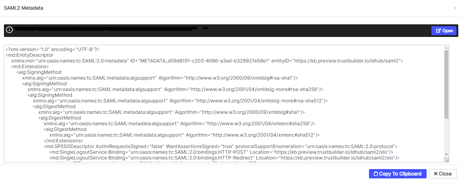 The TrustBuilder metadata appear. Select “Copy to Clipboard” to copy them and “Close”.