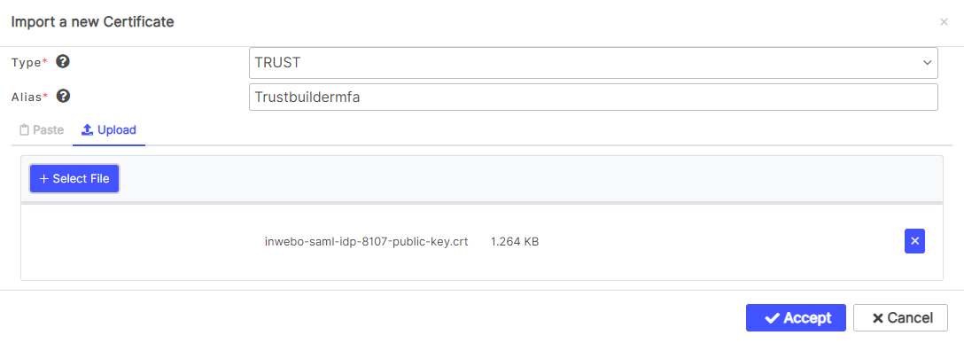 Paste the TrustBuilder metadata into “Metadata Service Provider (SP)”