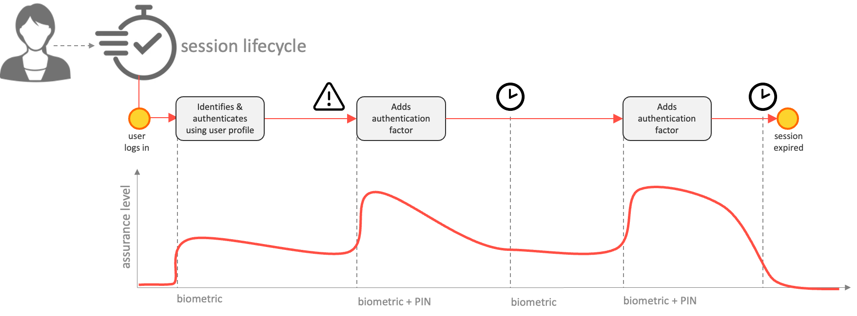 A user session has a lifecycle during which multiple authorisation requests are made. While a user has a session, the user may be providing additional authentication assurance, or conversely, the risk context of the session may degrade over time. As such, a TrustBuilder session has a lifecycle and the session state changes over time.