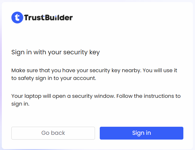 https://portal.[TENANT_ID].trustbuilder.io/.If requested, select TrustBuilder FIDO2.