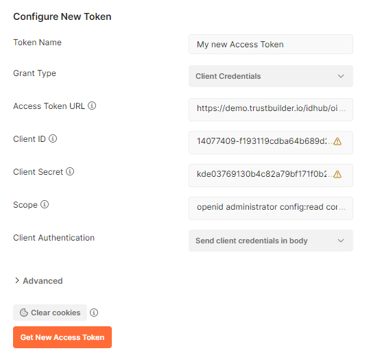 openid administrator config:read config:write userdata users:read users:writeClient Authentication → Select “Send client credentials in body”