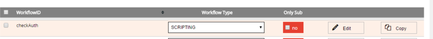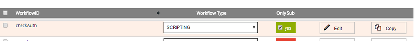 If a workflow is created or saved as a draft workflow. A draft workflow is one that can be invalid and is not validated upon save, is not exported or added to the configuration file. In this instance the row is highlighted orange.